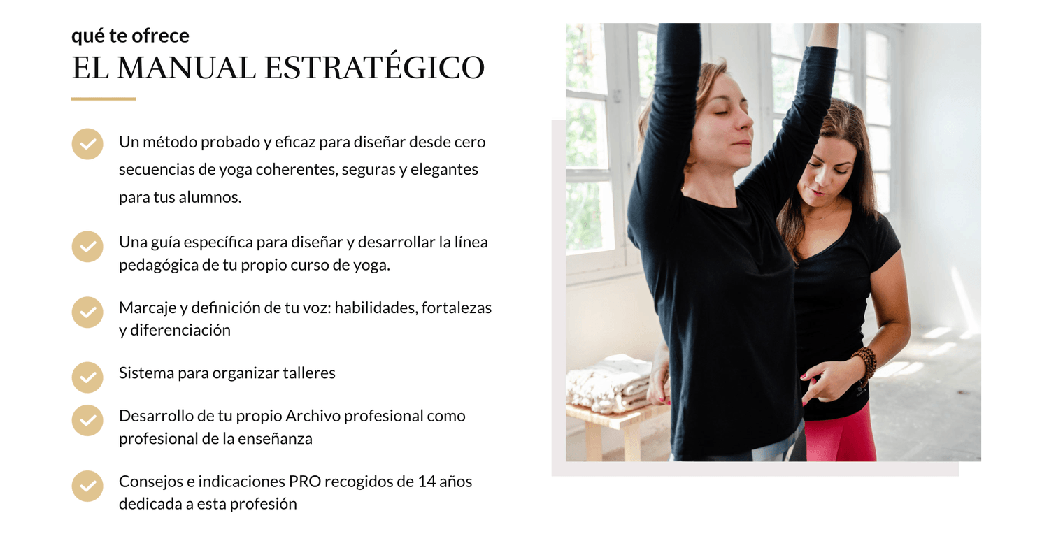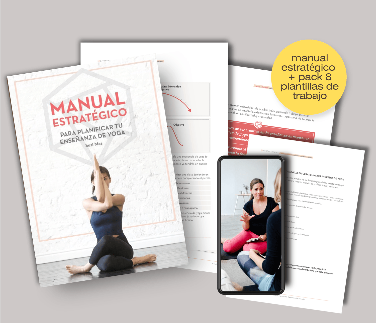 ¨El Manual Estratégico lo recomiendo 100% cómo punto de partida. Al salir de las 200H me vi con la hoja en blanco, y el Manual me ha ayudado a poner todas las ideas que daban vueltas en mi cabeza de manera organizada y estratégica. Me ha sido de gran ayuda sentarme a pensar un hilo conductor para organizarme con un objetivo anual. Y las plantillas y los audios extras al Manual, traen info que aunque pueda parecer obvia, para mi, cómo profe nueva me ha dado claves para por ejemplo, guiar savasana. No dudaria de seguir preparándome cómo profe con susi en futuras formaciones o si se anima, en la parte II del Manual 🙂